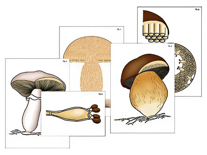 Пособие включает 8 карточек, иллюстрирующих особенности строения и размножения трубчатых и пластинчатых шляпочных грибов. Карточки ламинированы матовой (антибликовой) пленкой и снабжены магнитными креплениями, что позволяет монтировать схемы на магнитной доске или экране для динамических пособий.