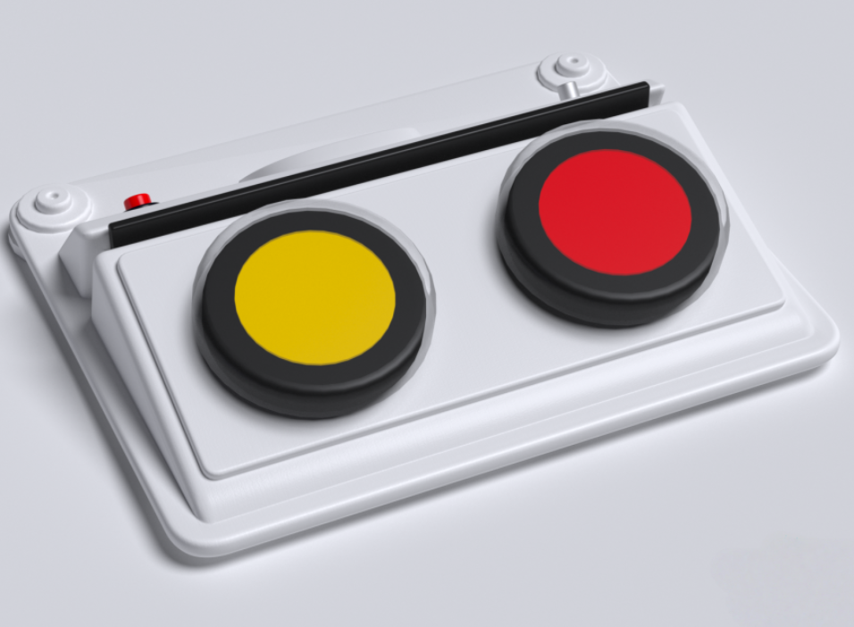 Игровой коммуникатор 2-х кнопочный со вставкой разработан специально для помощи в социализации детям, имеющим проблемы со слуховым, визуальным, тактильным восприятием и коммуникацией. Представляет собой корпус с плавным углом наклона, на котором размещены 2 кнопки для записи голосовых сообщений. Коммуникатор можно дополнять изображениями, которые помещаются в прорезь над кнопками. Устройство изготовлено из высококачественного ударопрочного пластика, имеет обтекаемые плавные формы без острых краёв и углов.