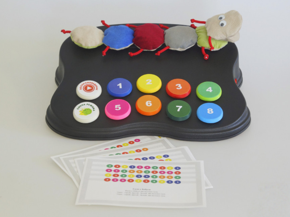 В комплекте с улиткой  6 карточек, на которых цветными кружочками записаны ноты песен. Цвет кружочка-ноты соответствует кнопке того же цвета на игрушке.