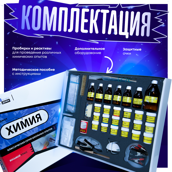 «Химия 8 класс» идеально подходит для учеников, которые хотят углубить свои практические навыки по химии в домашних условиях. Набор незаменим при семейном или удаленном образовании. (Проводить эксперименты необходимо под присмотром взрослых). Набор химика развивает внимательность и аккуратность, формирует умение самостоятельно задавать, формулировать вопросы и искать ответы на них в справочной литературе.