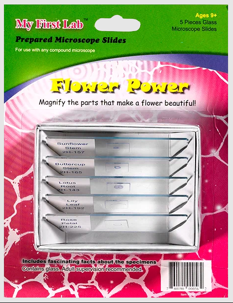 Данный набор микропрепаратов  для микроскопа «Цветы» содержит полностью готовые образцы биоматериалов, которые заключены между предметным и покровным стеклами. Наличие воздуха исключено. Стекла надежно закреплены и прослужат долгие годы. Подходит для любого микроскопа.