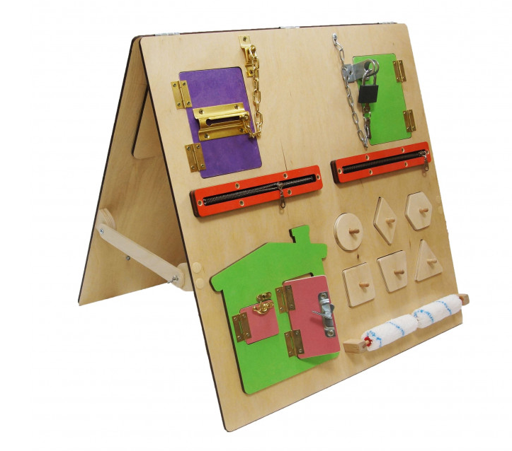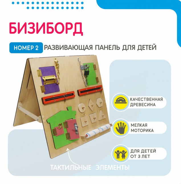 Бизиборд изготовлен из натуральной древесины - это насыщенный развивающий игровой опыт для малышей от 3-х лет. Он оснащен дверцами с защелками, меховыми валиками, сортером с фигурками на штырьках и одежными застежками на молнии. Бизиборд №2 развивает моторику и помогает детям развить фингермоторику и координацию движений. С ним игра становится не только увлекательной, но и познавательной.