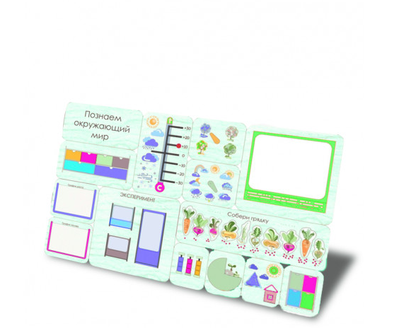 Дидактическая настенная панель на тему мира вокруг меня представляет из себя игровой модуль, на поверхности которого изображен окружающий мир. Например, градусник со шкалой, где наглядно можно отличить холод от тепла, времена года и погодные условия. А еще целая грядка овощей, за которой необходим уход и полив. Дидактическая настенная панель на тему мира вокруг меня можно использовать для игры детей как в группе, так и индивидуально.