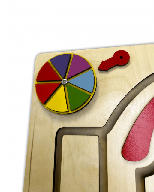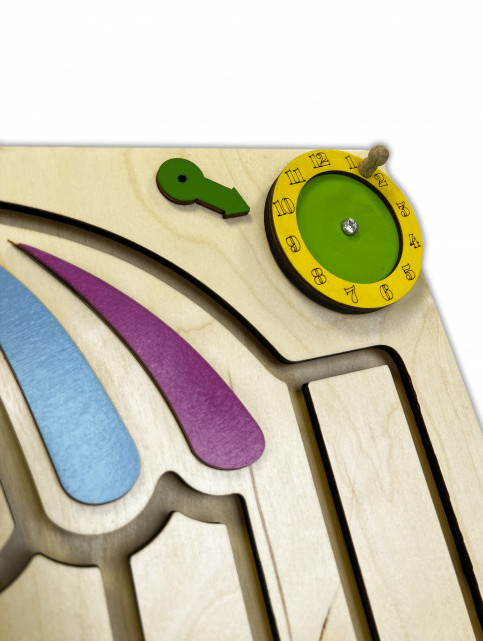 Перемещая разноцветные элементы внутри тактильного лабиринта по траектории с верхушки зонтика вниз (имитируя падение капель дождя), ребёнок может сортировать их по цветам или распределять в произвольном порядке. Счёты познакомят малыша с основами математики, а циферблат – с понятием времени.