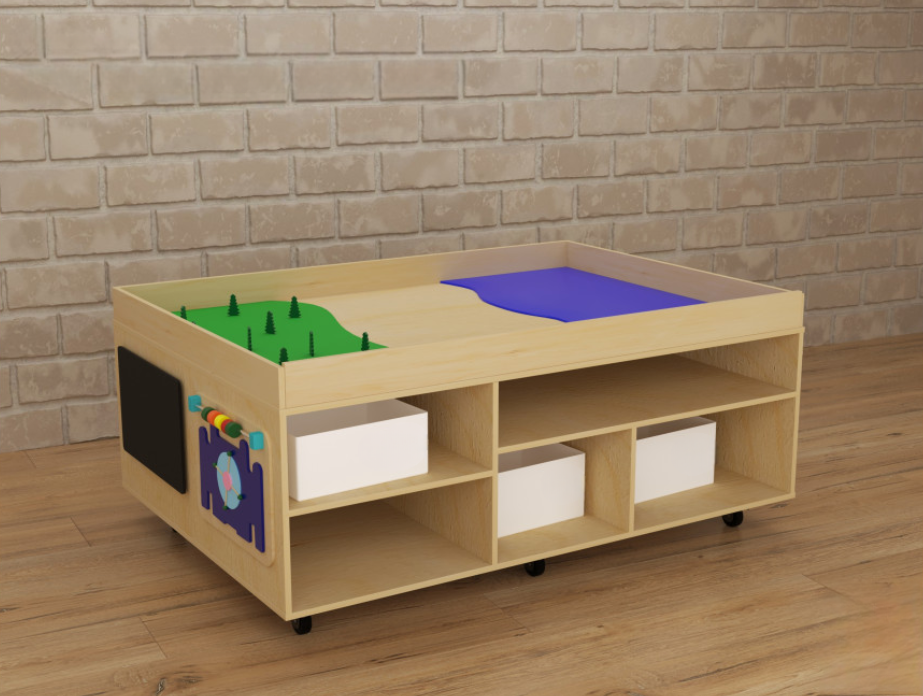 STEAM Многофункциональный стол с локациями моря, суши и леса – многофункциональный развивающий детский игровой модуль. Главное его преимущество – рациональное использование имеющихся площадей – на столешнице расположена ландшафтная локация, а на боках стола – развивающие элементы и полки-ячейки; это делает его необходимым элементом оснащения пространства для занятий с детьми. Стол имеет колёсики – это позволяет без труда перемещать его сколько угодно раз по помещению, не задействуя большое количество силы и не повреждая напольное покрытие. STEAM столы широко используются дошкольными педагогами и некоторыми узкими детскими специалистами – логопед, дефектолог, психолог – для групповых и индивидуальных занятий с детьми дошкольного и младшего школьного возраста.