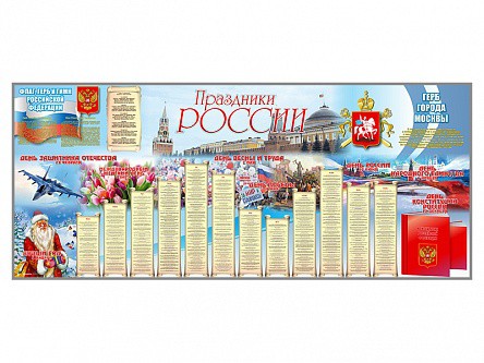 Настенное полотно представляет собой виниловую ткань, на которой размещена информация о праздниках России, а также о флаге, гербе и гимне Российской Федерации и гербе города Москвы.
