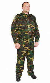 Костюм "Офицерский", зелёный камуфлированный, состоит из куртки и брюк. Куртка укороченная, с центральной застежкой на тесьму-молнию, с нижними прорезными карманами на молнии и верхними накладными, с клапаном и закруглённым бочком на кнопках , рукав втачной, длинный, на манжете. Низ куртки на притачном поясе, по бокам стянут на эластичную тесьму. Брюки прямые на притачном поясе со шлевками, с центральной застежкой на тесьму-молнию, карманами с отрезным бочком и задним прорубным карманом с клапаном. С отстроченными стрелками и усилениями в области колена. Рекомендуемые материалы: смесовые ткани, грета. ГОСТ 25295-2003